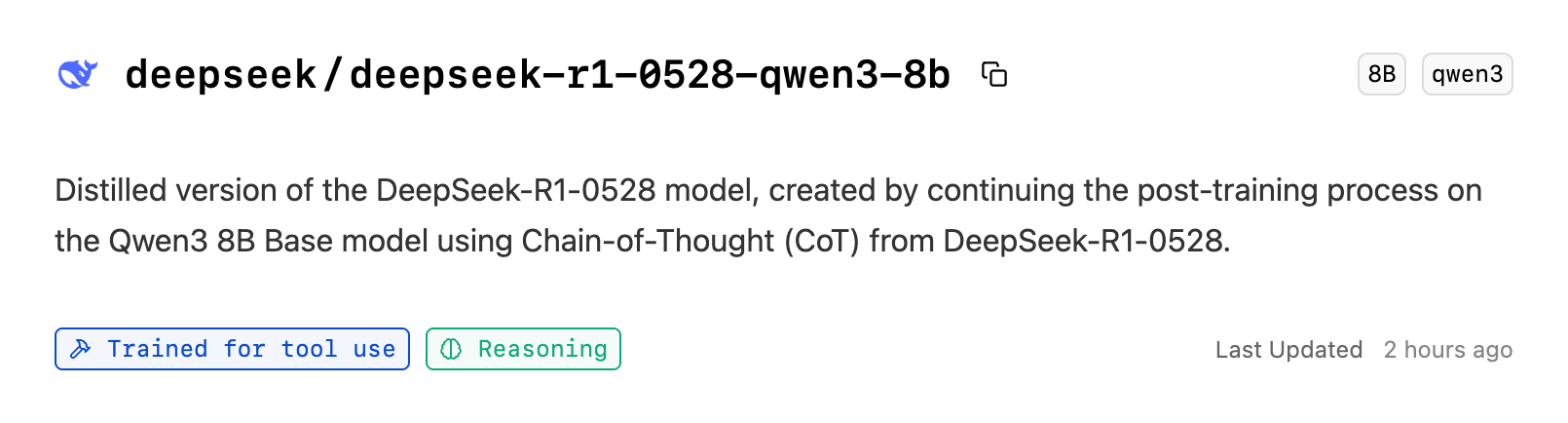 DeepSeek-R1-0528-Qwen3-8BAs a part of R1-0528 release, DeepSeek also shared DeepSeek-R1-0528-Qwen3-8B, a "distilled" model created by continuing the post-training of Qwen3 8B Base using chain-of-thought traces from DeepSeek-R1-0528. This smaller model also supports both tool use and reasoning.