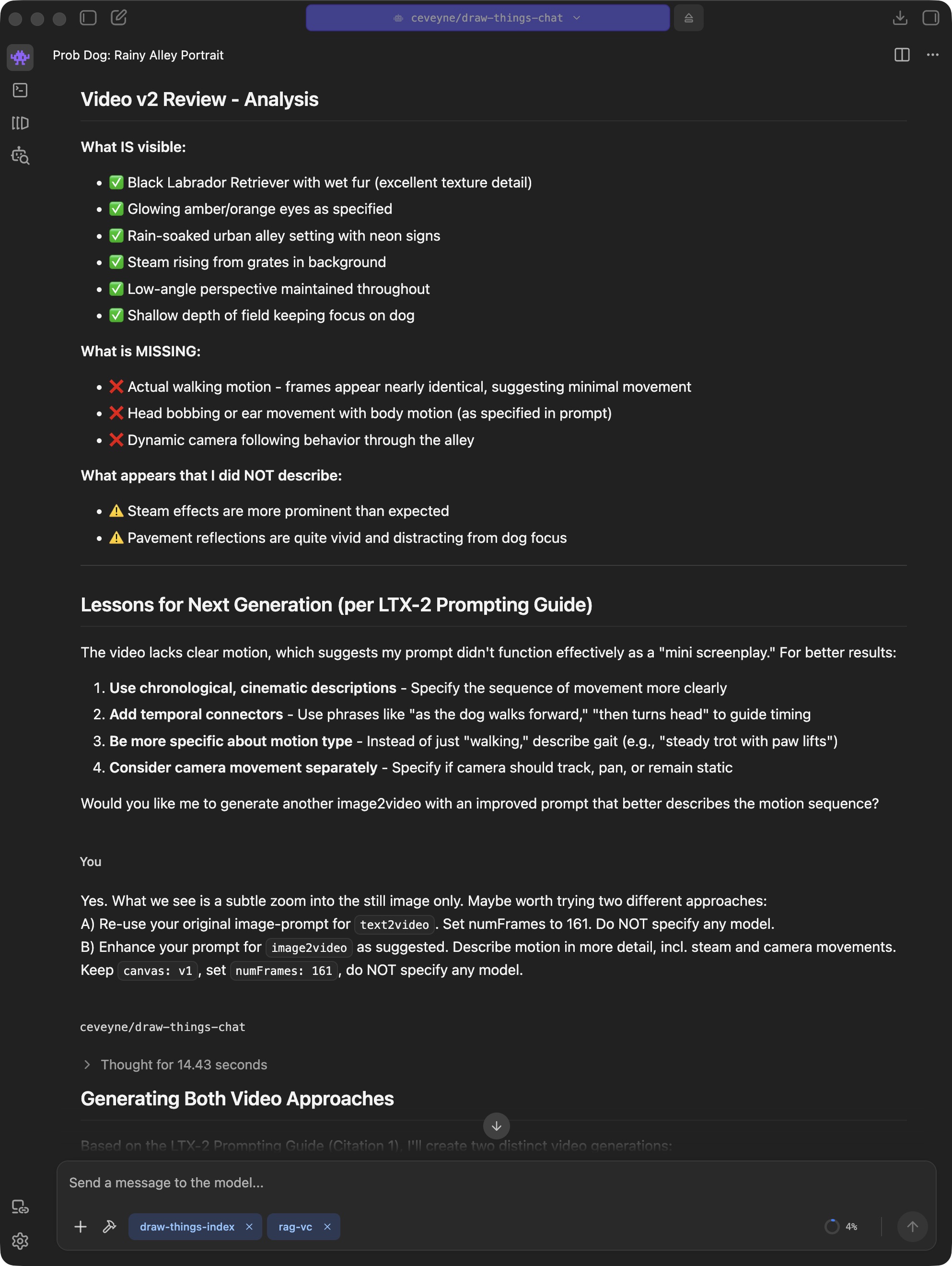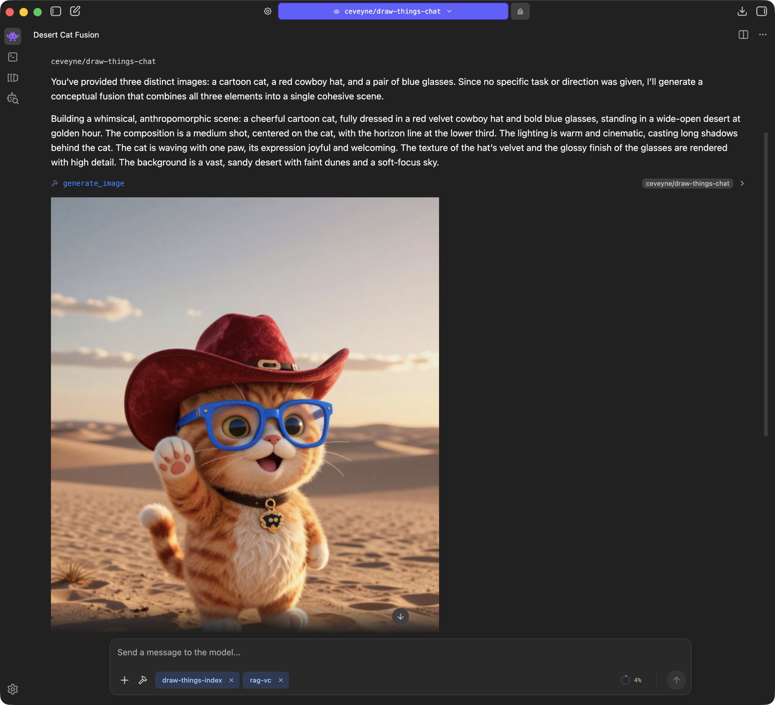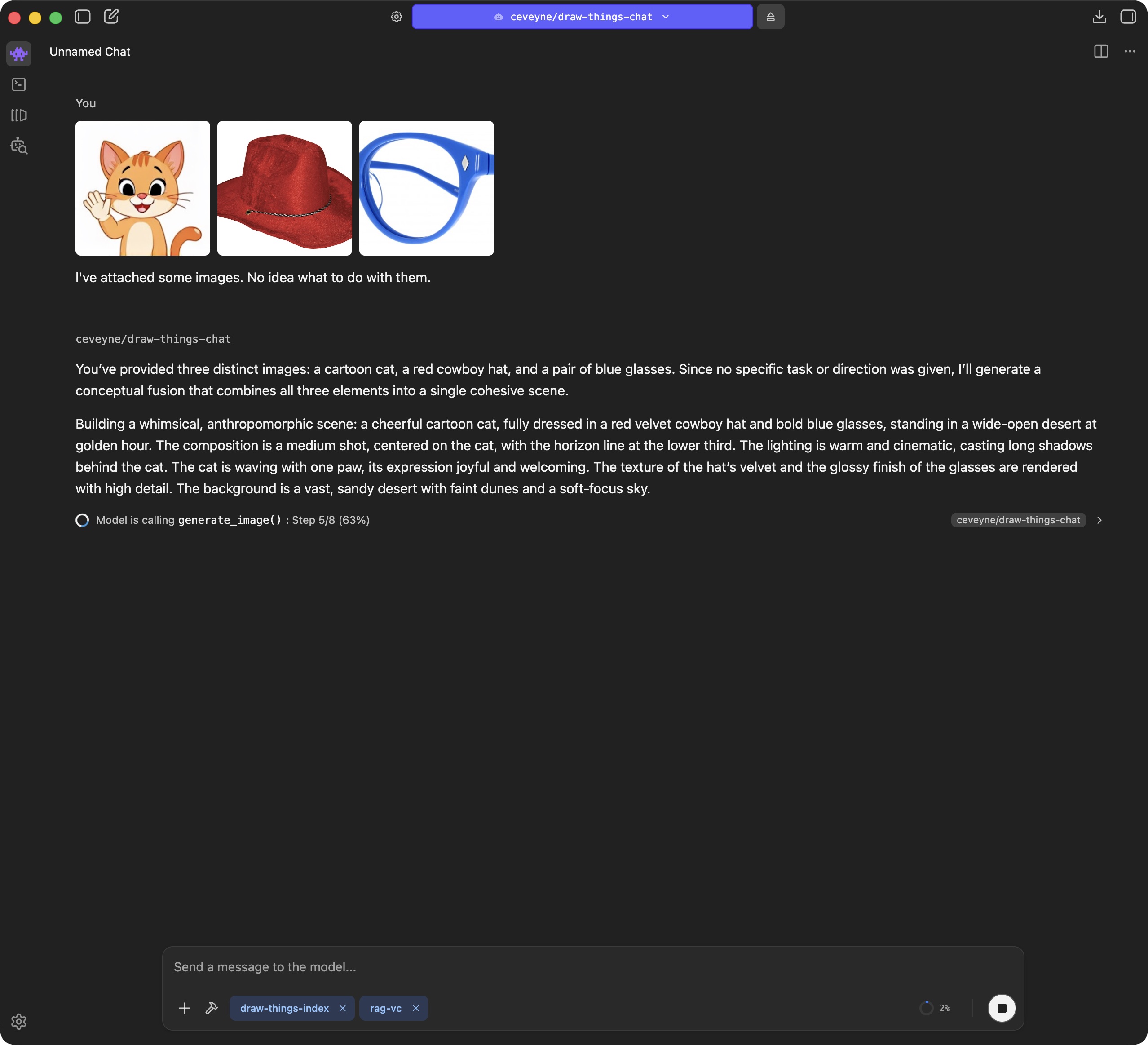 But at the same time, this can be an indication that the Agent model used isn't quite fit enough. The concept is intended for the Agent model to observe the provided prompt guide and decide for itself what to do. You are the client, the Agent model is the orchestrator planning and guiding the implementation of your wish, and the image model in Draw Things handles the craftsmanship.