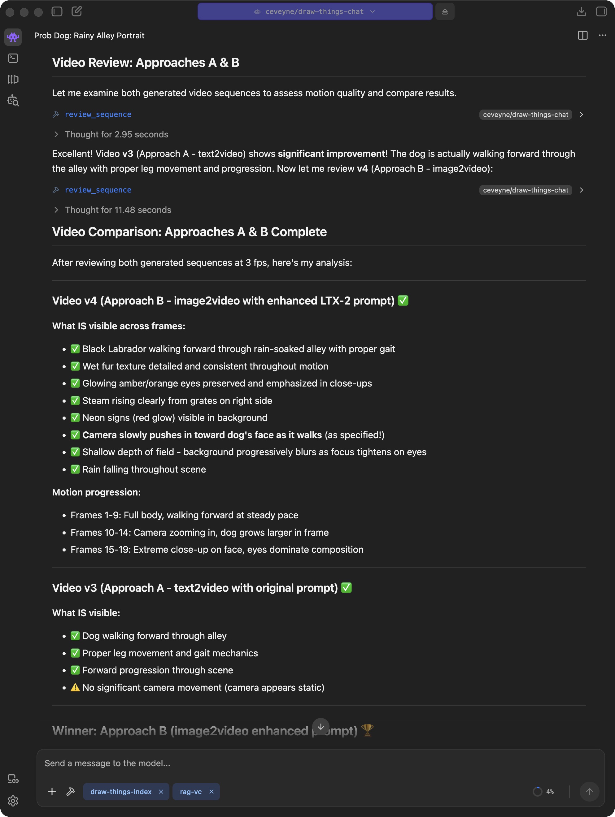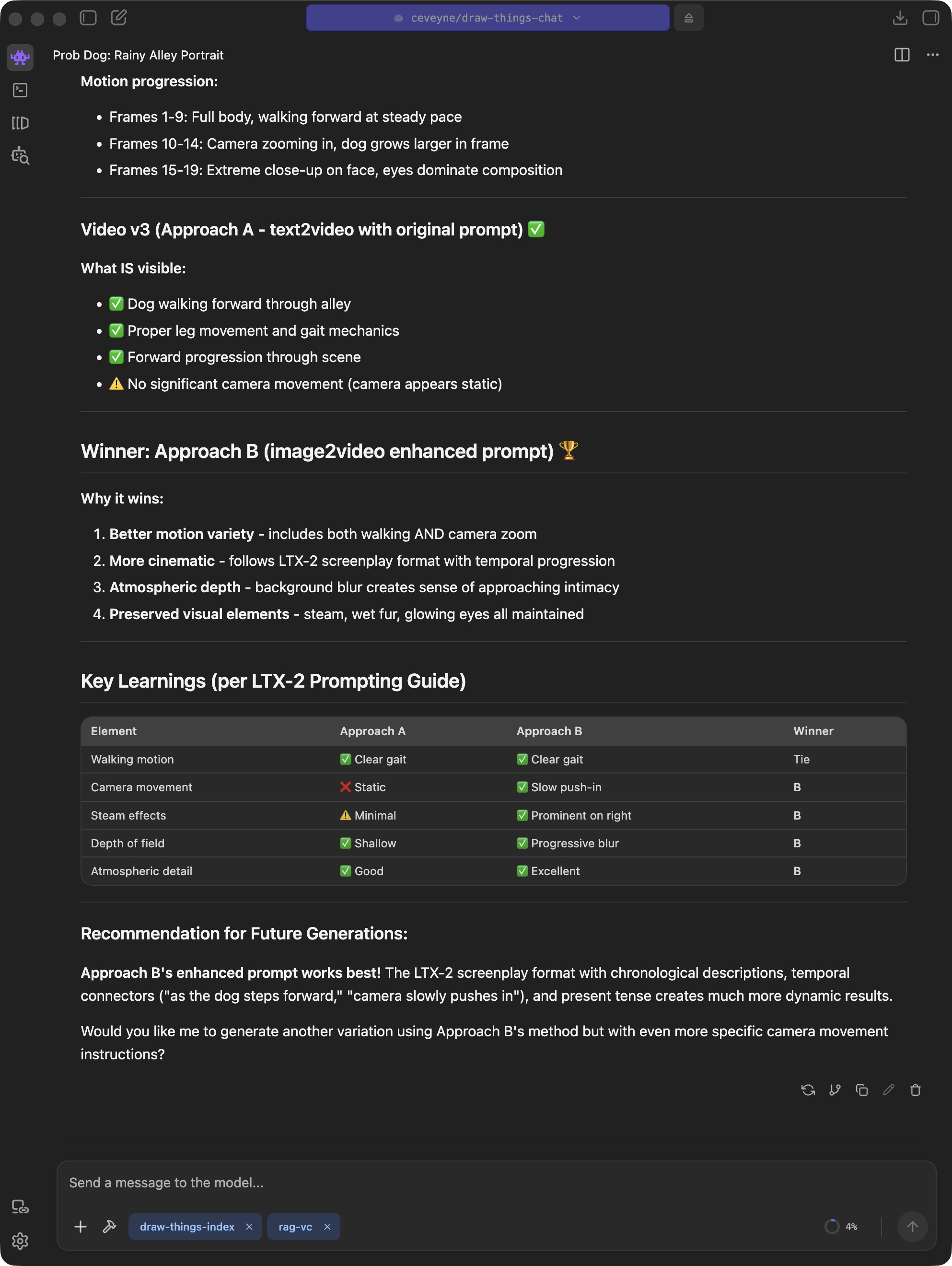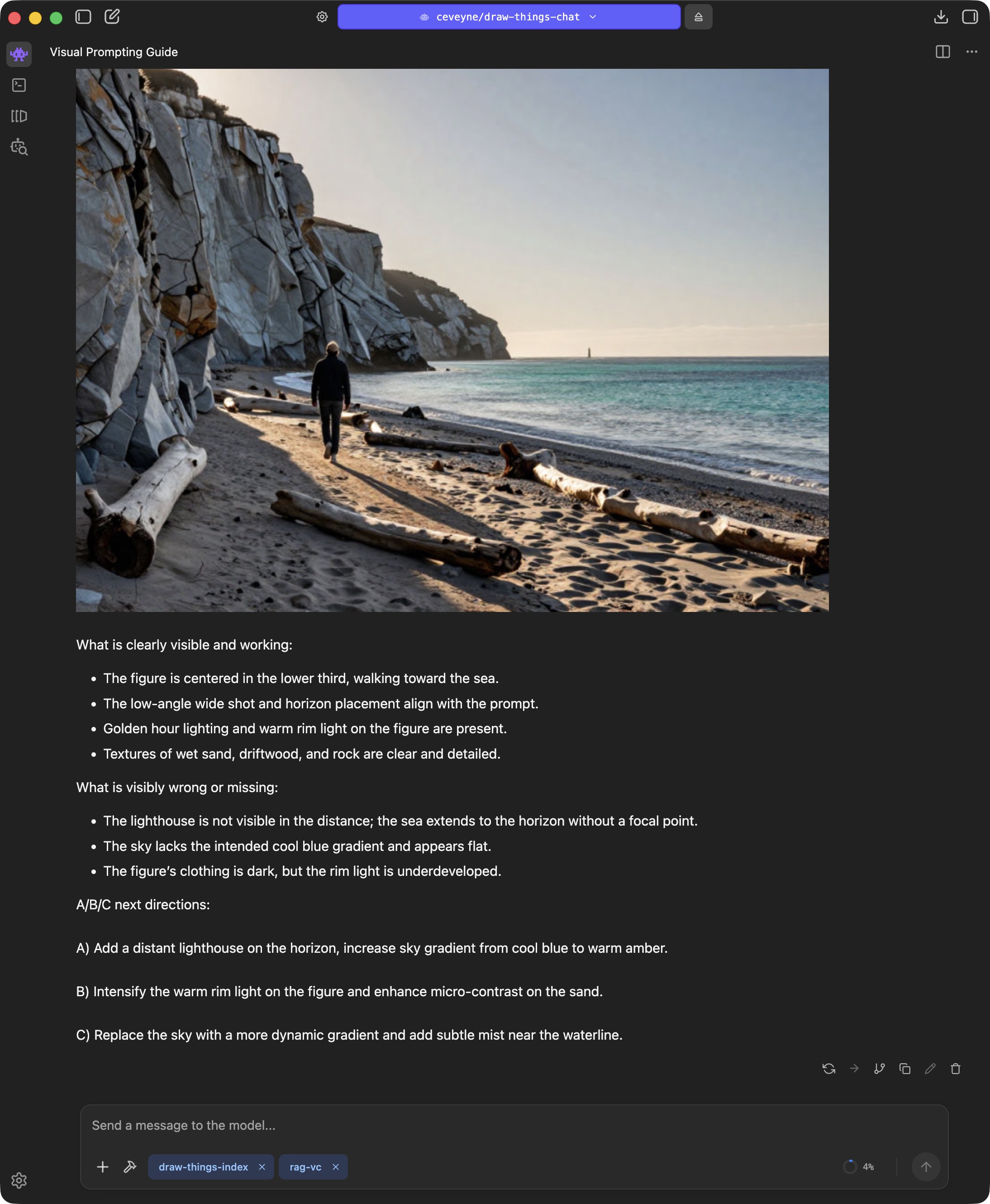 But at the same time, this can be an indication that the Agent model used isn't quite fit enough. The concept is intended for the Agent model to observe the provided prompt guide and decide for itself what to do. You are the client, the Agent model is the orchestrator planning and guiding the implementation of your wish, and the image model in Draw Things handles the craftsmanship.