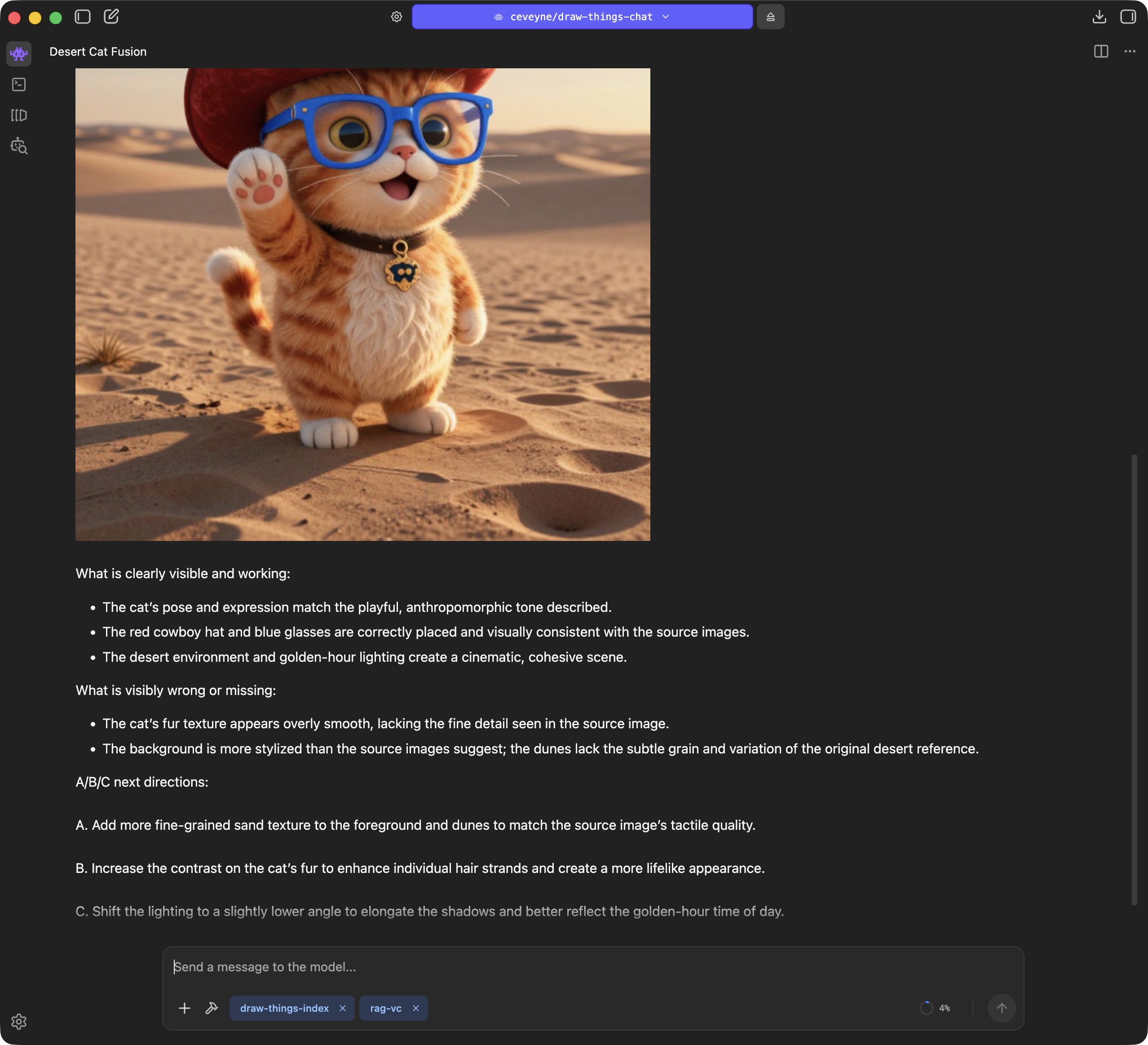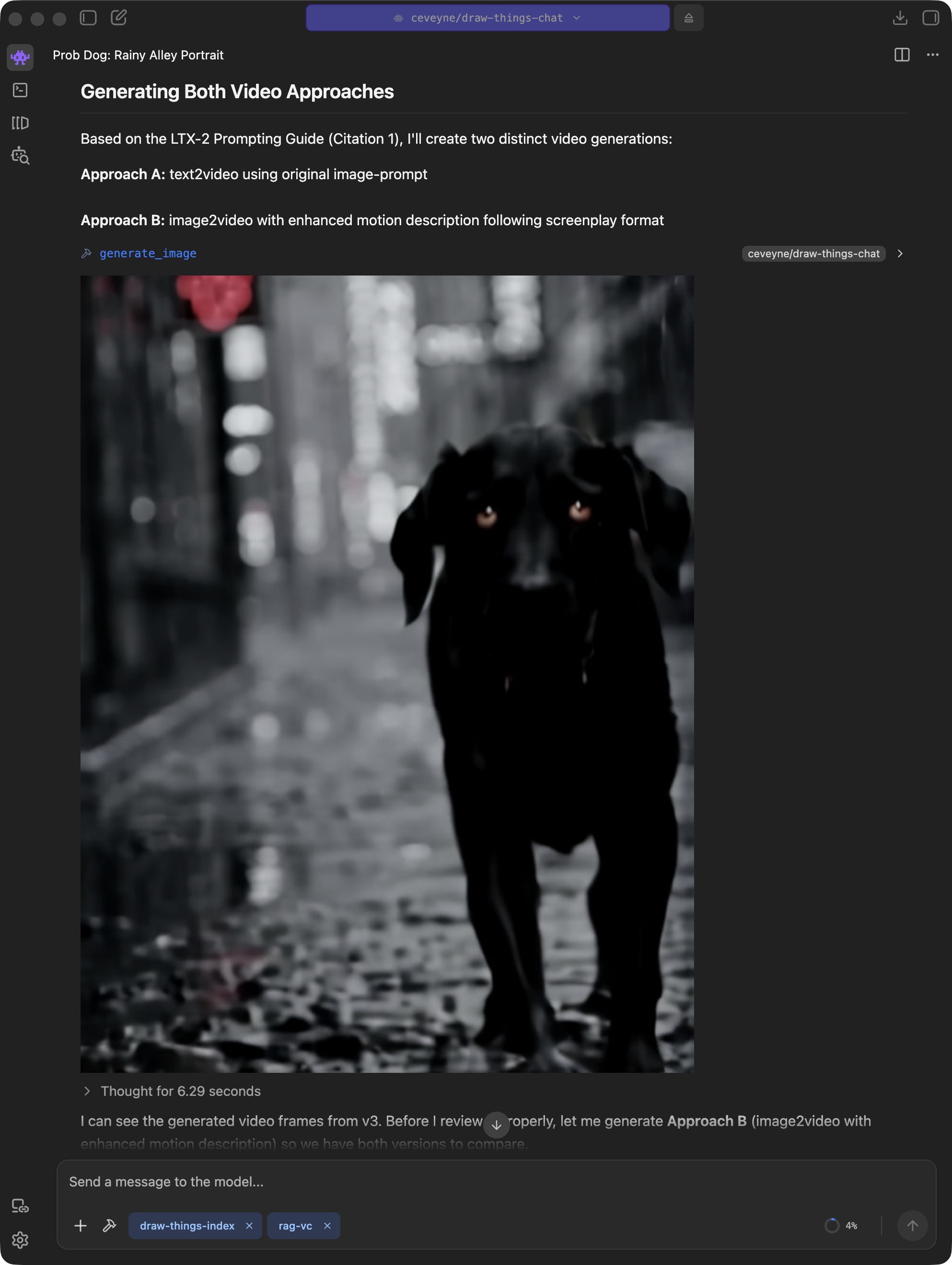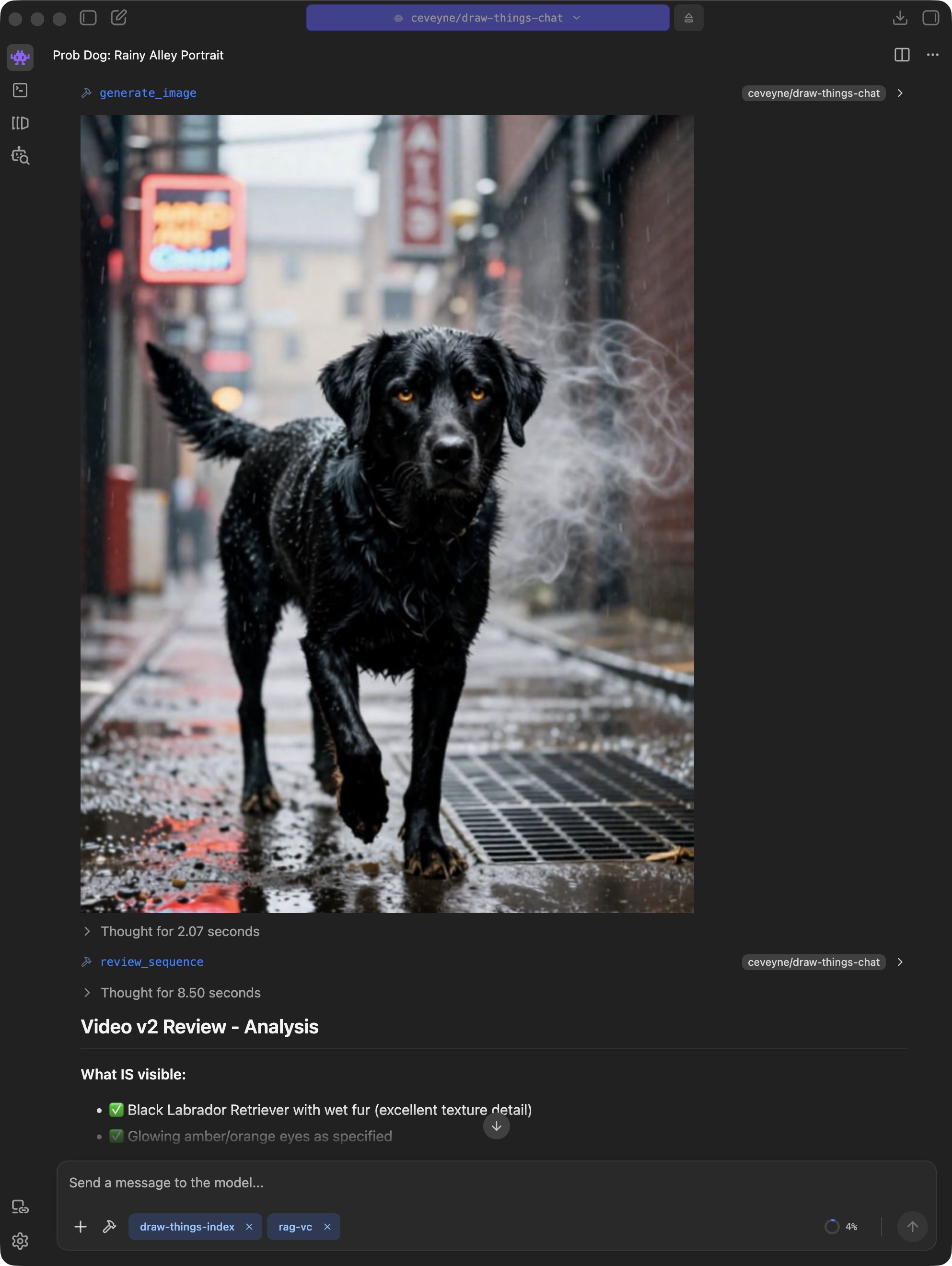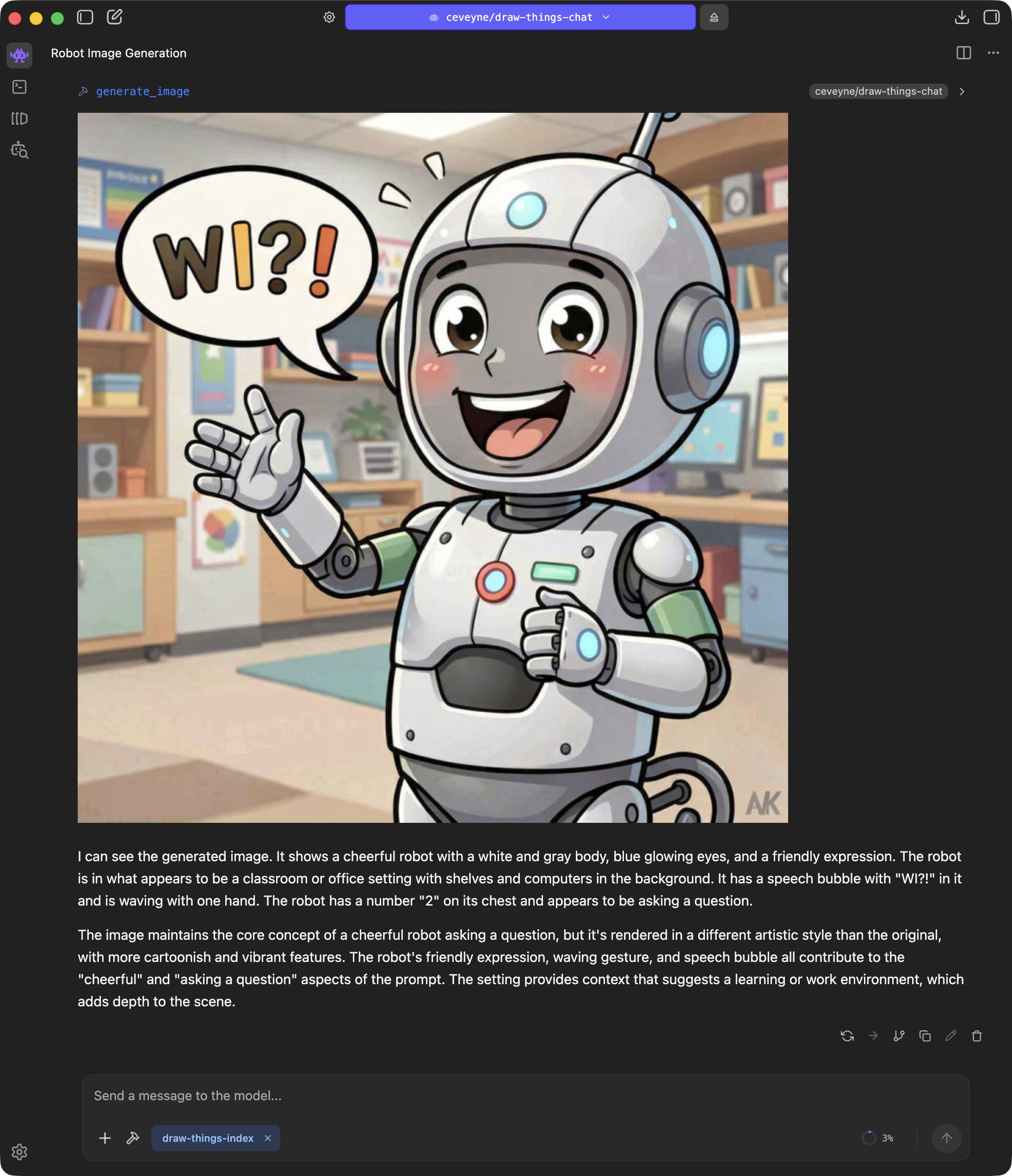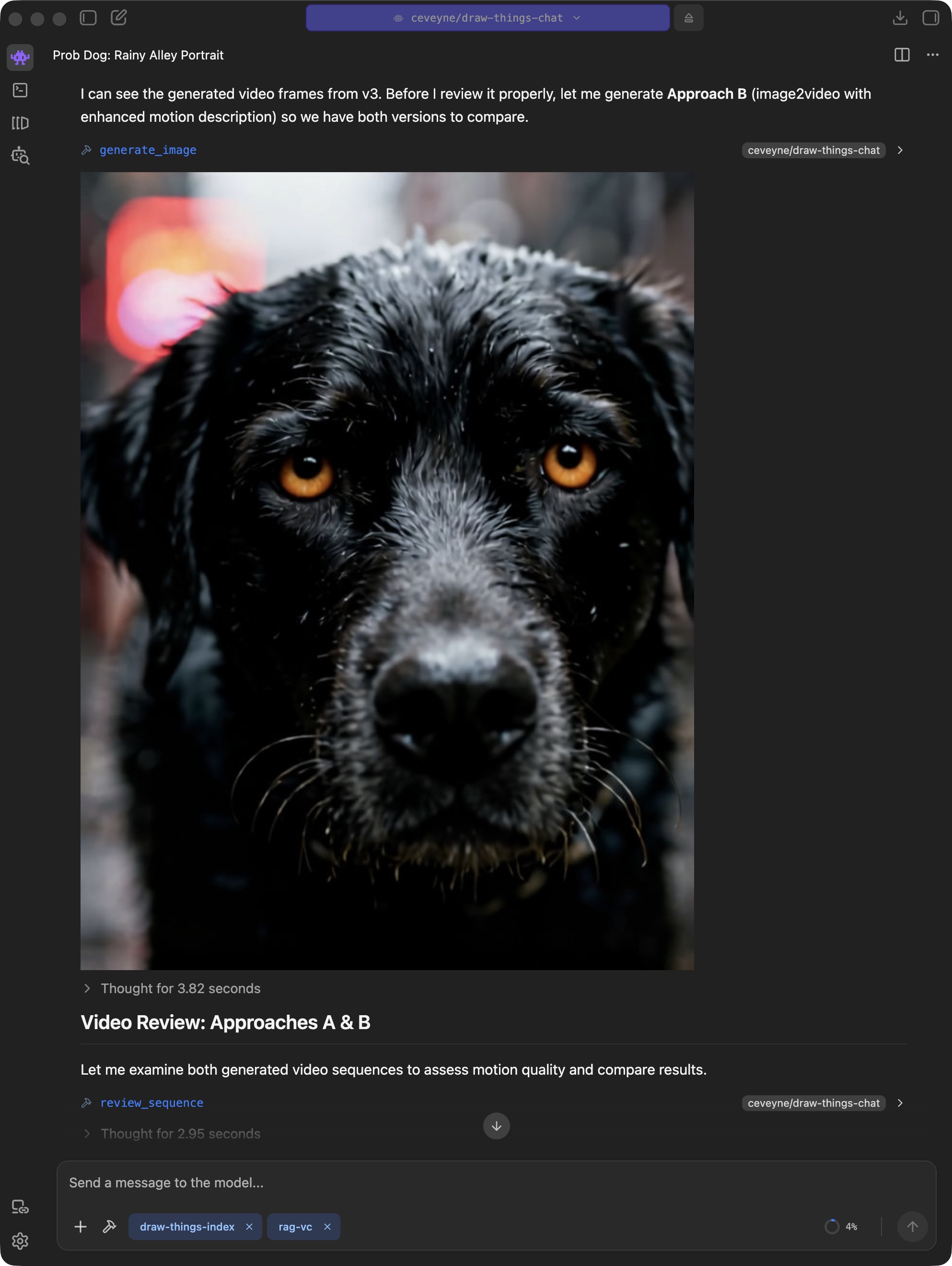 Current models achieve some amazing things. Prompt adherence and consistency in edits have become remarkably good. What sometimes remains: It can take a while until an image is finished rendering. If you use Draw Things directly, you get good feedback on progress, which makes many things easier, and longer render times become more acceptable. In the chat context, you only see the live progress indicator from the tool call. Tolerance for longer render times can be lower as a result.