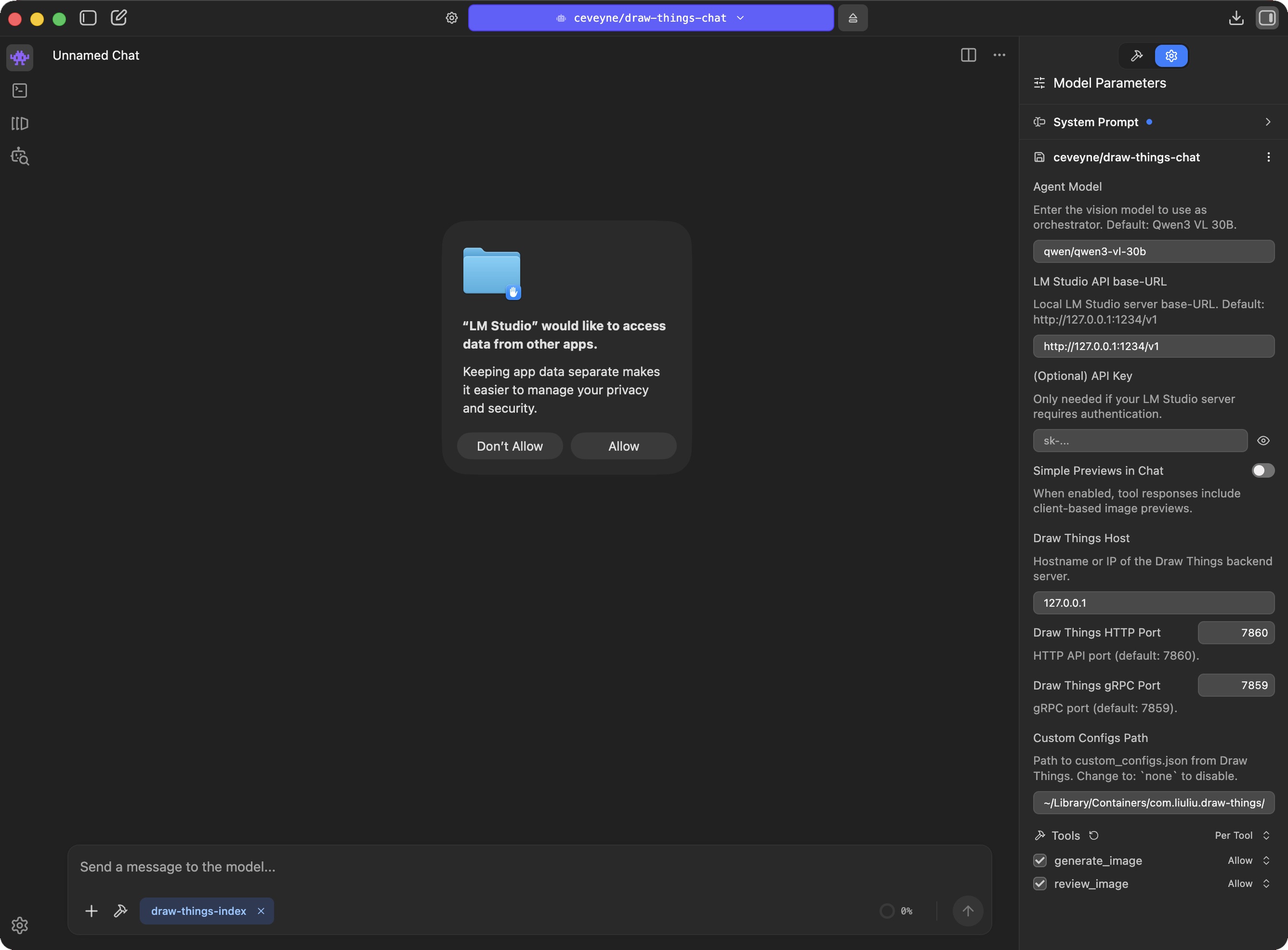 As soon as LM Studio loads the draw-things-chat plugin, a pop-up asks for access rights to files of other apps. This is due to read access to the custom_configs.json of Draw Things.