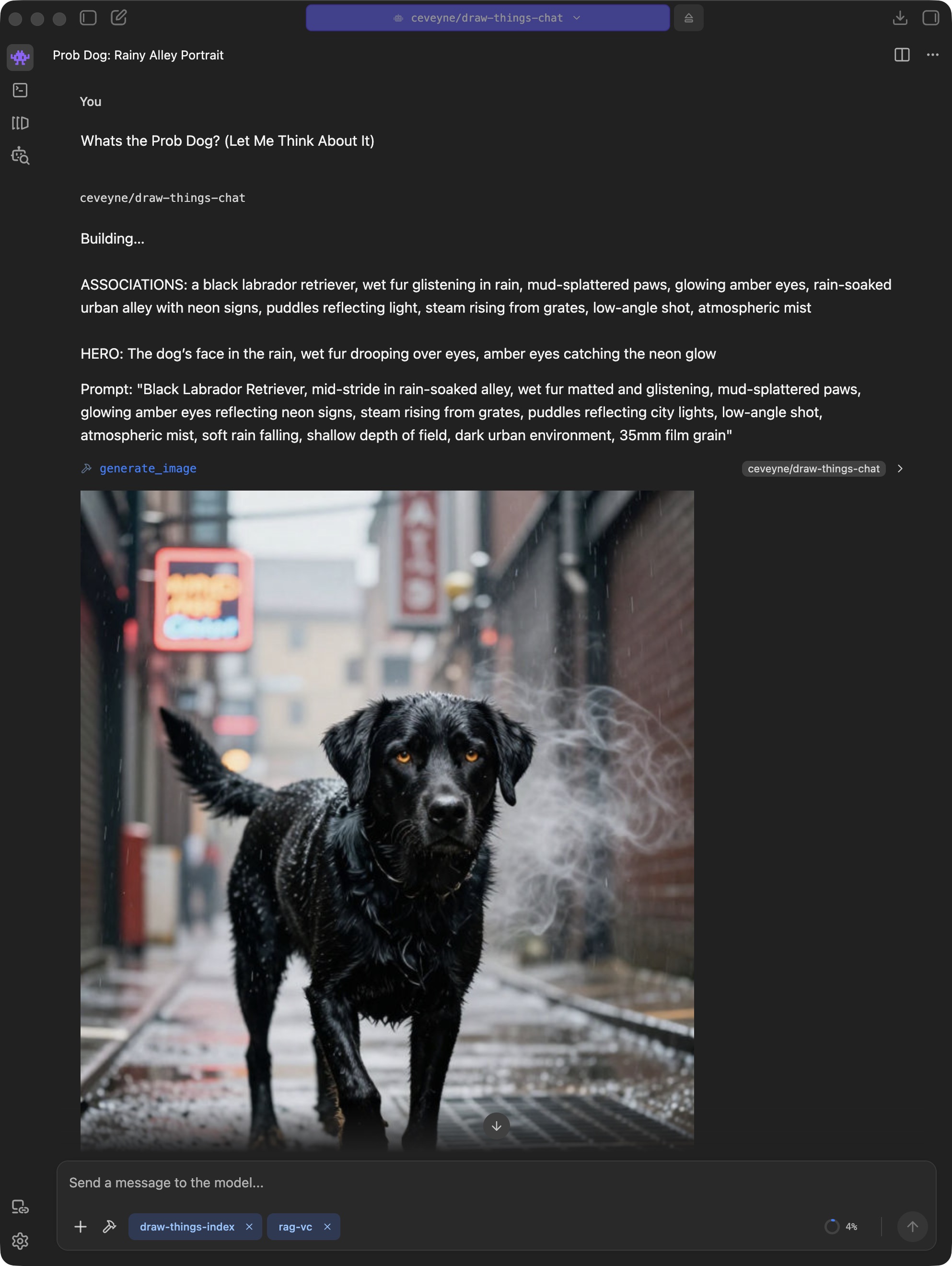 π draw-things-chat can be extensively adapted to your own ideas and wishes. This way, you can achieve the familiar results of the native Draw Things client within the chat context of LM Studio. Achieving this requires only a little manual work.