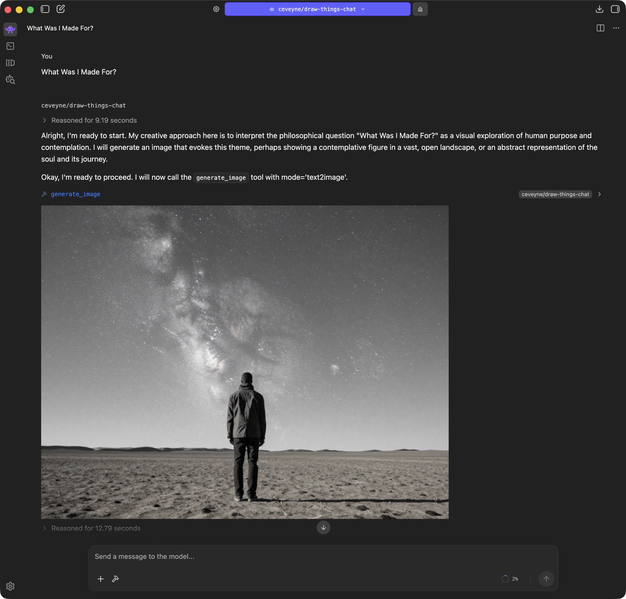 As it's questionable if simply plugging Draw Things into LM Studio might be of any benefit, enlightening your vision-capable Agent-Model with your generated images can sometimes be... surprising.