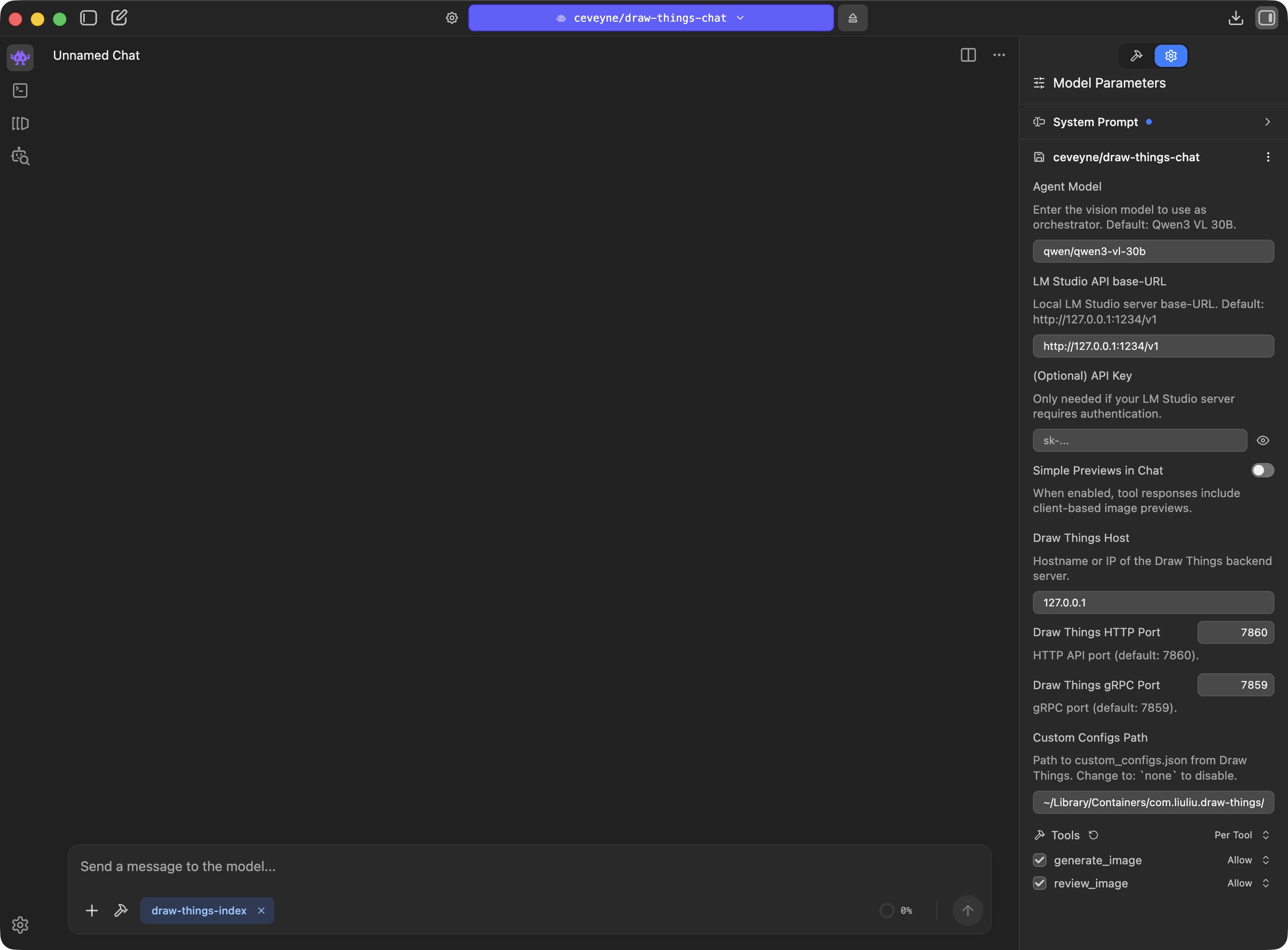 For draw-things-chat to find the file, you must adjust the Custom Configs Path accordingly.As yet, the biggest issue is that some of the local, vision-capable language models are not optimally equipped regarding modern functions like tool use, possibly even stemming from the "pre-MCP era", and thus struggle with "agentic" tasks or simply do not have Vision capabilities well integrated.