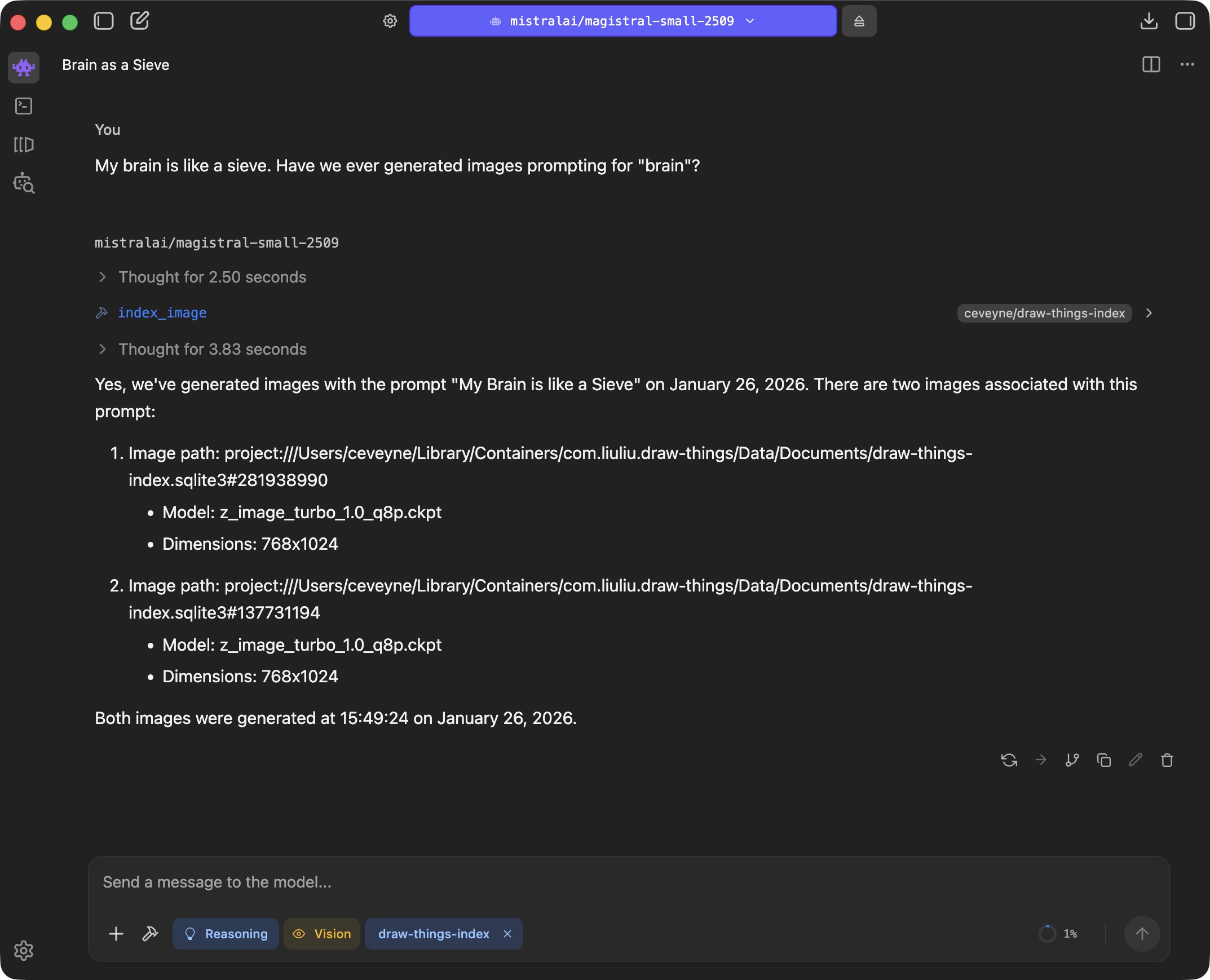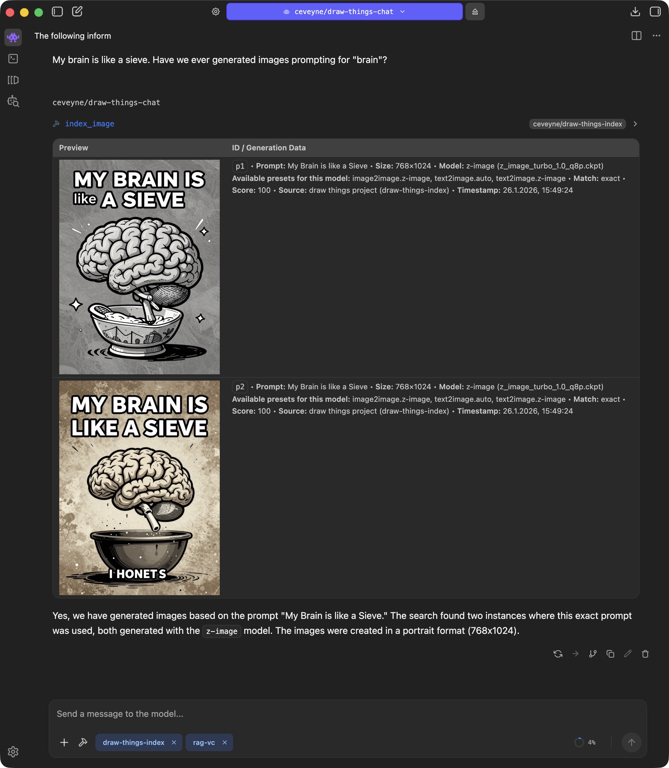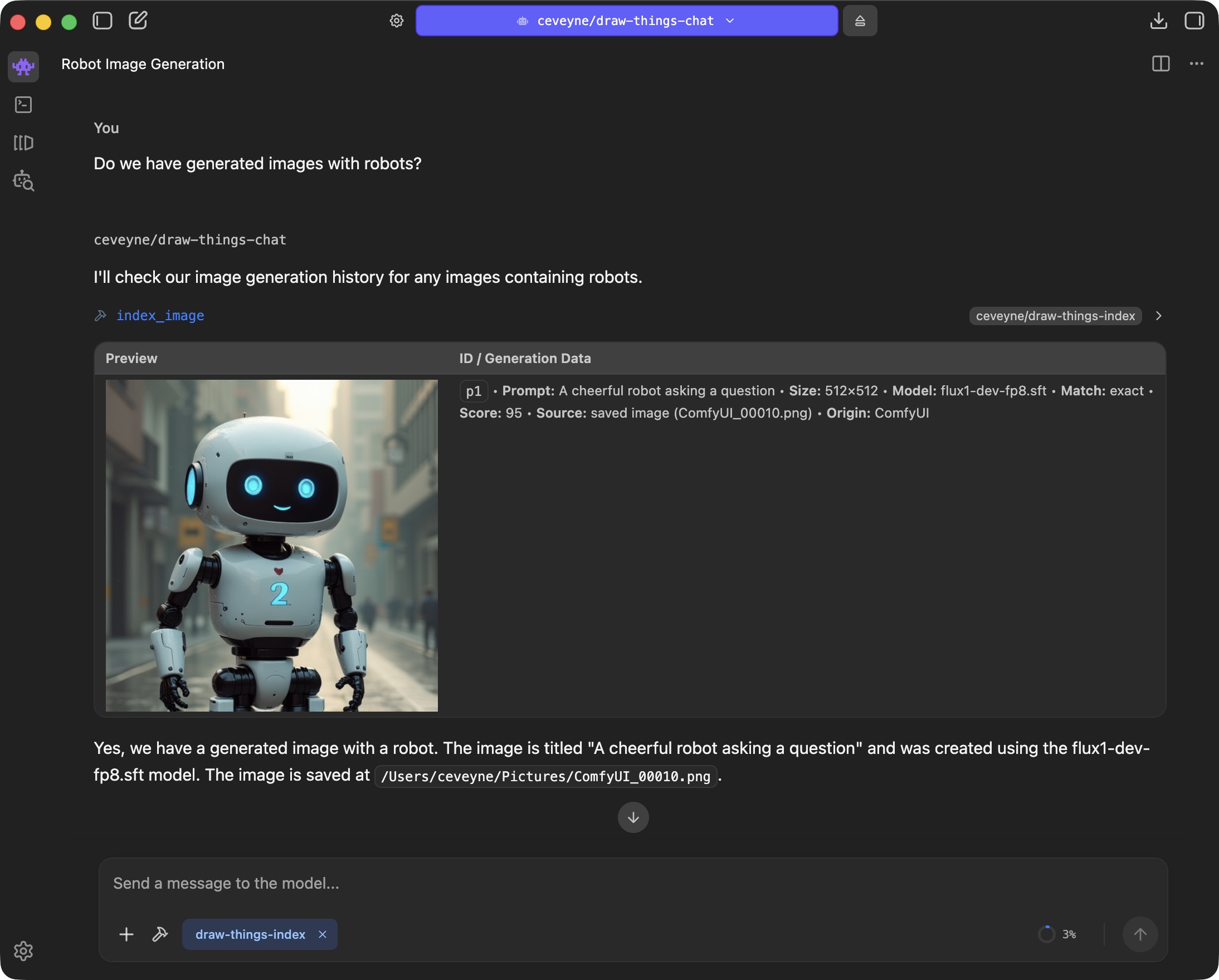 β οΈ Note: Even with draw-things-index, the agent model doesn't have direct access to individual generation parameters. However, you can use the info from search results to create new presets or improve your existing ones.