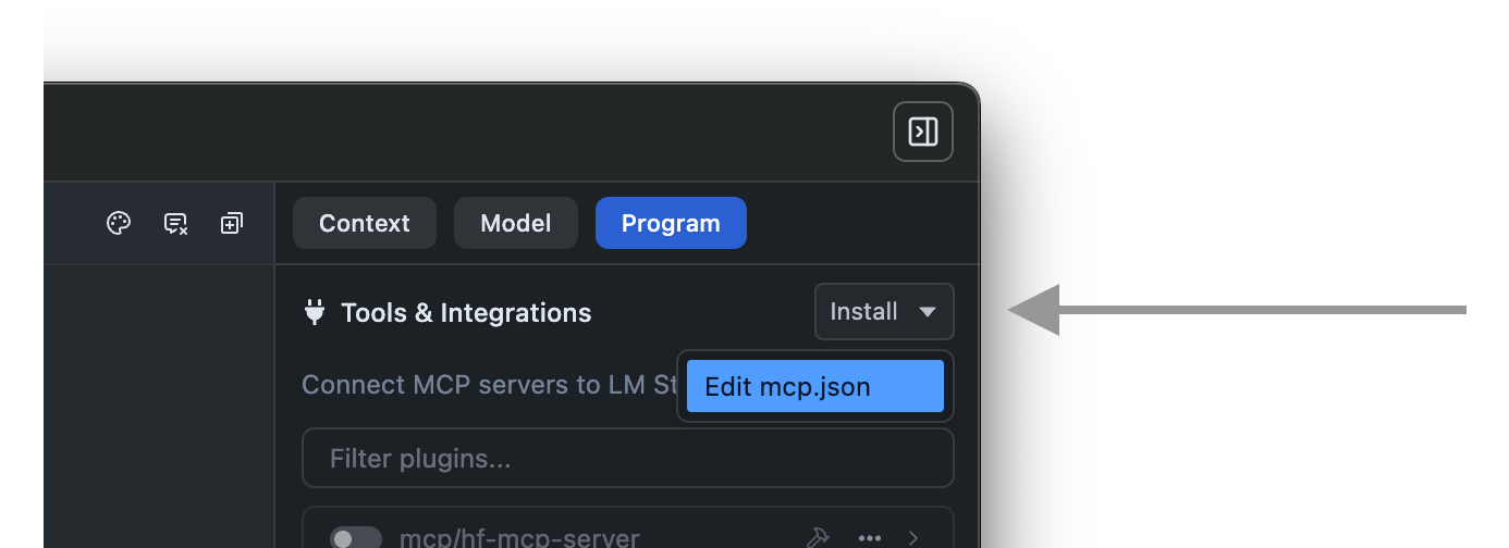 Switch to the "Program" tab in the right hand sidebar. Click Install > Edit mcp.json.