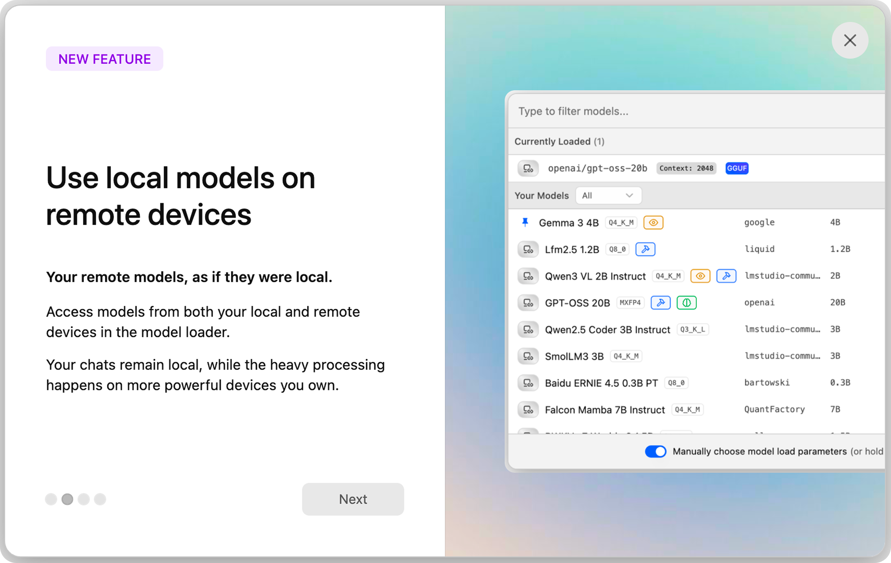 You can filter the model loader to display only local or remote models, or to display all available models at once. Remote models can be loaded and configured with the same familiar controls, either in the GUI or by using lms in the terminal.